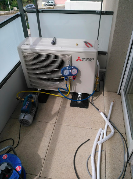 Notre technico-commercial propose à notre client d'installer une climatisation réversible (capable de chauffer et rafraichir) mono-split (une unité extérieure, une unité intérieure) console de la marque MITSUBISHI ELECTRIC.