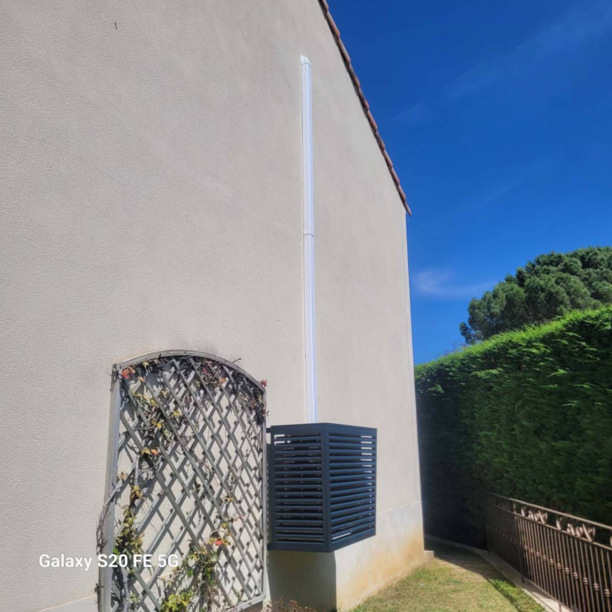 Afin que la façade de sa maison reste « élégante », il a choisi de mettre un cache climatisation de couleur grise anthracite et en aluminium sur le groupe extérieur. L’aluminium est bien plus résistant que le bois face au climat. Le cache climatisation protège donc également l’appareil.
