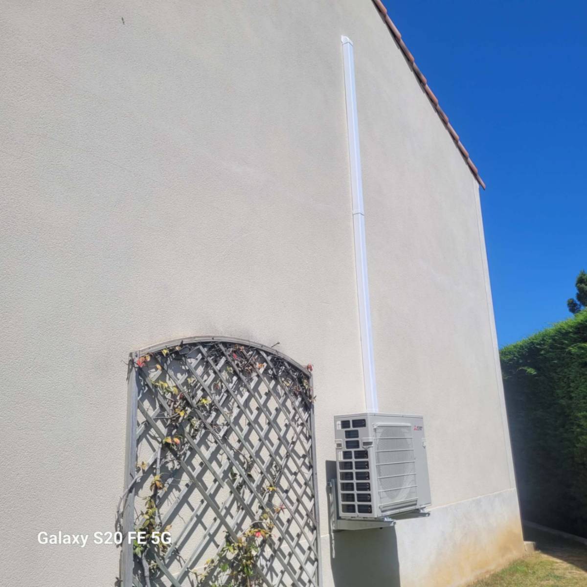 La configuration technique de l'installation a permis d'alimenter l'ensemble de la maison avec un seul groupe extérieur de type multi split de marque MITSUBISHI ELECTRIC référence MXZ-5F102. Celui-ci a pu être positionné à un endroit discret derrière la maison.